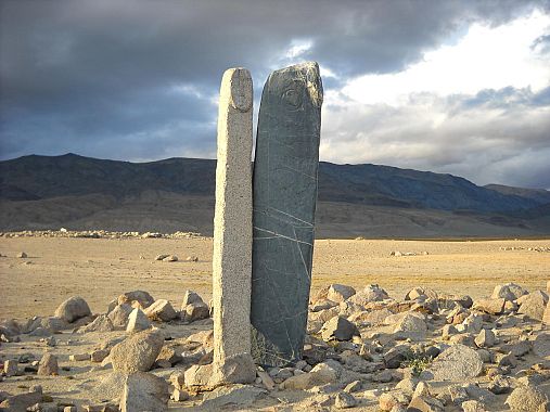 Qualche chilometro più in là ci aspettava un'altra sorpresa di natura archeologica, coeva alle incisioni rupestri: due stele di pietra collocate al centro di un'ampia vallata, una più massiccia e scura, l'altra, più chiara, sormontata da un volto ovale con i lineamenti allungati. Mi bastò un'occhiata e l'accostamento fu immediato: "Incredibile, una testa di Modigliani proprio qui, nella steppa sconfinata!".