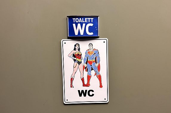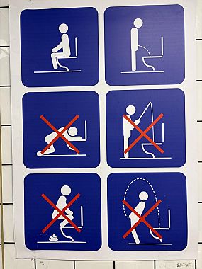 Il primo era la raffigurazione bidimensionale delle istruzioni per un uso buono e giusto del wc: prima le vignette con un omino stilizzato nelle posizioni corrette e poi quelle con i comportamenti vietati, alcuni dei quali talmente assurdi da far venire il dubbio che i poveri gestori abbiano dovuto affrontare per davvero clienti che pescavano nello scarico, si accovacciavano sul sedile al contrario per defecare fuori dal vaso oppure che, voltati di spalle, puntavano acrobaticamente il getto dell'urina verso l'alto per centrare la tazza all'indietro.