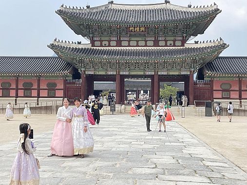 Ho capito però che mi stava sfuggendo qualcosa solo dopo essere entrata nel primo cortile della reggia successiva, Gyeongbok-gung: ovunque c'erano persone che sfoggiavano vestiti tradizionali, uomini e donne, giovani e bambini. Tutti impegnati a scattarsi foto e selfie. Tutti molto eleganti. Soprattutto in confronto a noi turisti occidentali, inguardabili in bermuda e maglietta.
