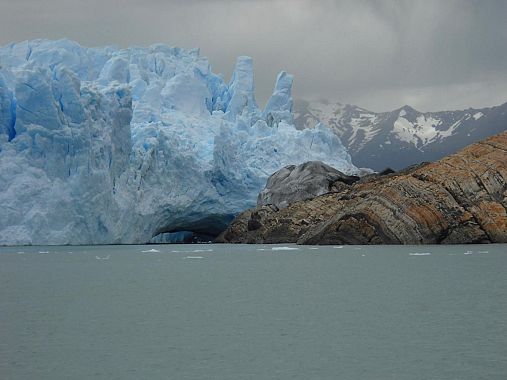 La parte terminale del Perito Moreno si appoggia sul Lago Argentina e ha un fronte di cinque chilometri che, scivolando su un cuscino d'acqua posto fra la sua base e il fondale, avanza di due metri al giorno, settecento all'anno; al tempo stesso però, sotto l'enorme pressione dell'acqua del lago, il fronte del ghiacciaio è anche in continua frantumazione.