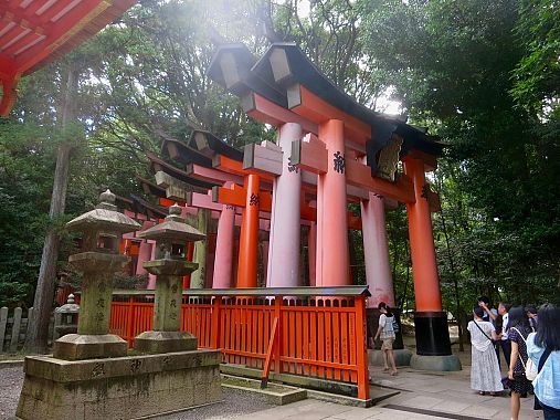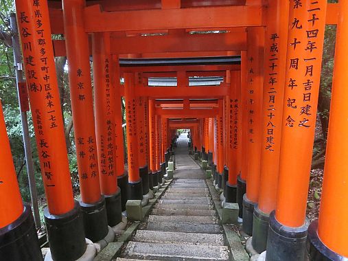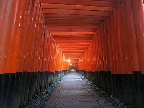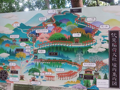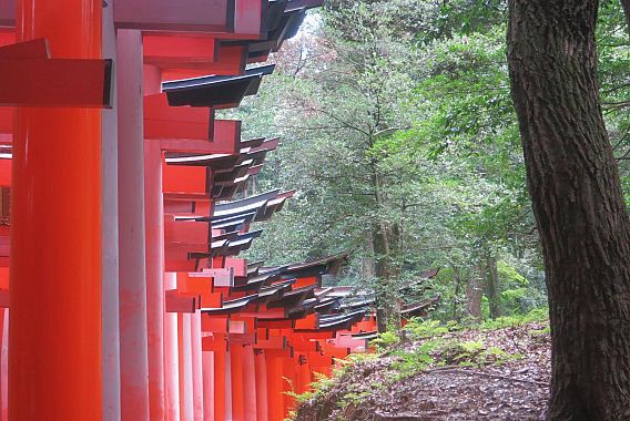 La galleria di torii è lunga quattro chilometri e segue un percorso circolare che parte dalla base della collina, sale fino al culmine e poi ridiscende, fra innumerevoli templi e scalinate. Il tutto è immerso in un bosco fiabesco, l'arancione dei torii brilla sul verde intenso degli alberi.