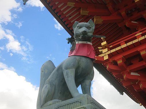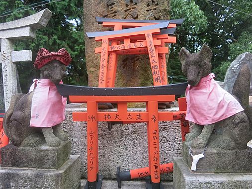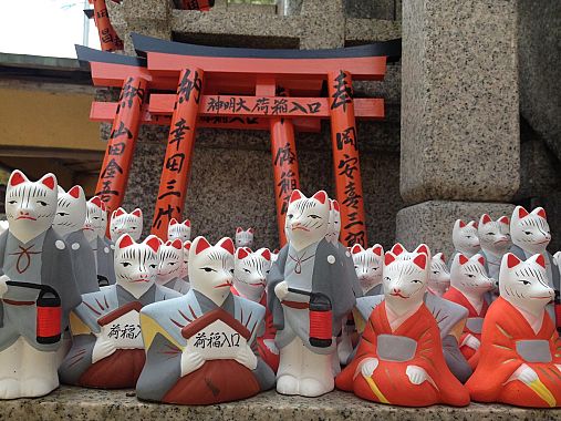 La volpe è l'animale che porta i messaggi del dio Inari. Nel santuario è rappresentata in migliaia di statue e statuine che tengono in bocca una chiave o un rotolo di carta di riso. La chiave apre simbolicamente la porta dei magazzini del riso mentre il rotolo rappresenta i messaggi di Inari che così, in tempi più recenti, è stato riconsiderato anche come protettore delle attività legate alla comunicazione. Giornalisti compresi. "Allora è il mio nume di riferimento" pensai di riflesso mentre osservavo, piuttosto divertita, le statue delle volpi, agghindate con bavagli, sciarpine e cappelli rossi oppure riprodotte in miniature colorate.