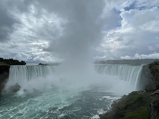 Fu solo dopo aver oltrepassato l'ingresso del Niagara Falls State Park, sul lato americano del fiume, che ci rendemmo conto che no, quella colonna di fumo che vedevamo all'orizzonte non era prodotta da un incendio: si trattava invece di una colossale nube di vapore generata dal più grande dei tre salti d'acqua dal Niagara: le Horseshoe Falls. Il ferro di cavallo.