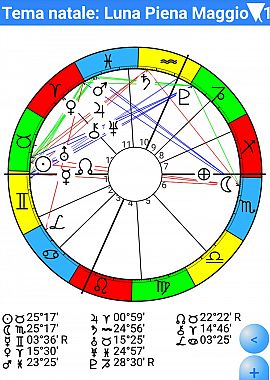 A metá mese ci saranno diversi aspetti difficili tra i pianeti, il 16 maggio la Luna Piena sará piú carica di tensione, per la quadratura di Saturno ad ambedue luminari. Invece una giornata bella dovrebbe essere il 19 maggio, Mercurio, giá in moto retrogrado formerá un bell’aspetto con Giove. Il 27 maggio Venere e Plutone si sfideranno, il 29 maggio si perfezionerá la congiunzione tra Marte e Giove, il 30 maggio avremo una bella Luna Nuova nel segno dei Gemelli.
