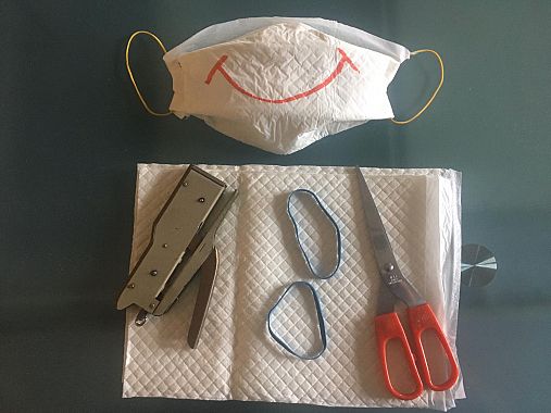 Occorrente: dei tappetini igienici per cani, dimensioni 60x60, un paio di forbici, elastici (sarebbero ottimi quelli di stoffa, ma vanno bene anche quelli semplici di gomma e si possono riutilizzare), una cucitrice. I tappetini li ho pagati meno di 5 euro (confezione da 10), in commercio,se ne trovano in un qualsiasi negozio per animali anche a prezzi più bassi, da ogni tappetino si ricavano 6 mascherine: il costo di una mascherina è inferiore a 10 centesimi, ci si può stare.