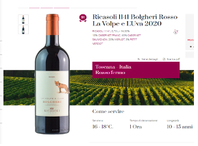 Quando le istituzioni europee, recentemente, cancellarono le radici Cristiane dalla Costituzione Europea, già in quel momento si istituzionalizzarono gli affari nel “Tempio”. Non voglio drammatizzare contro i mercanti moderni (salutisti) a orologeria, il tempo non gioca loro favore; Potranno mettere piccoli aggettivi allarmanti sulle etichette quanto vogliono, scrivendo su una “montagna”storicamente enoica, ma i consumatori li ignoreranno. Forse, tenteranno altro: come proibire al Parroco di celebrare l’eucarestia con il vino, ma farla con la Coca Cola? Per sdrammatizzare aggiungo dei detti toscani legati agli usi e costumi della gente che calzano bene nei confronti dei salutisti: nella UE “mangiano a secco?” Fanno ragionamenti che: “non hanno ne mamma ne babbo?” Oppure: “escono dal seminato?”. Lascio a voi giudicare. Intanto restando con la nostra cultura enoica secolare, voglio proporre un vino di Bolgheri Rosso DOC 2020, “La Volpe e L’uva” dell’azienda vinicola Ricasoli. Un’azienda blasonata nata nel 1141, ma soprattutto prestigiosa per merito del barone Bettino Ricasoli, 1809-1880, che è stato un propulsore del disciplinare del vino Chianti, individuando l’uvaggio con Sangiovese (Sangioveto), Canaiolo e Malvasia Toscana, il più idoneo, già da quando,1834, Ricasoli fu parte degli esperti che componevano il consiglio dell’Accademia Nazionale dei Georgofili, nata nel 1753 in Firenze.