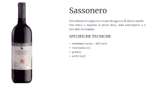 Il vino è: “Sassonero DOC Maremma Toscana” 2022 fatto di uve Sangiovese e piccole percentuali di Shiraz e Merlot. Esame organolettico. Colore: rosso rubino carico. Profumo: vinosità contenuta e armonica, sentori di frutti rossi, (mora) liquirizia. Gusto: Pieno, si ripete la liquirizia, leggermente astringente, caldo e sensazione finale notevole.
