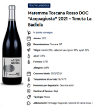 Personalmente ho degustato il Rosso della Maremma DOC “Acqua Giusta” con un uvaggio bordolese Cabernet Sauvignon, Merlot e Shiraz. Il 2021, mi ha dato le seguenti sensazioni degustative. Colore: rosso rubino con riflessi aranciati. Olfatto: Elegante, con sentori di frutti neri maturi, (ciliegia Marasca). Gusto: ben strutturato, caldo, e notevole persistenza.