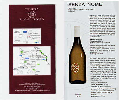 No sono d’accordo che non gli dia un nome (scusami Diego, so che è un tuo diritto). Un vino che mi ha entusiasmato; se lo degustate non cercate di capirlo subito, è complesso, aspettate qualche minuto dopo averlo versato nel calice. Ecco le mie sensazioni. Vino: Senza Nome, uve di Vermentino in purezza, macerate e lasciate con il mosto 3-4-giorni in barriques, separarlo dalle bucce e poi per altri sei mesi sui lieviti autoctoni nella stessa Barriques.