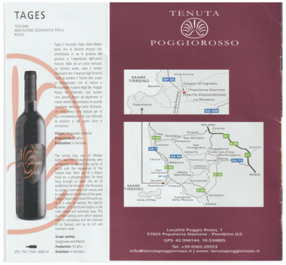 Succedeva spesso di trovare vini con l’acidità volatile alta di acido acetico. Questa disfunzione era vecchia di millenni, e nelle zone più regredite è perdurata fino agli anni 1980. Dal questa data è stato un crescendo della qualità dai vini assemblati o in monovitigno. Il Sangioveto (oggi Sangiovese) è migliorato sotto ogni aspetto enologico ma, spesso, si fa notare tanto al profumo che al gusto per la sua peculiarità astringente dovuta ai tannini non nobili e eccessivi. Nel suo consumo, però, trova sempre il consumatore che lo preferisce avendo quella tipicità di un vino dal forte carattere. Ecco, quello che vi propongo questa volta è un Sangiovese con aggiunta di una piccola parte di Merlot, dell’azienda Poggio Rosso situata a ridosso della zona archeologica etrusca di Baratti-Populonia.