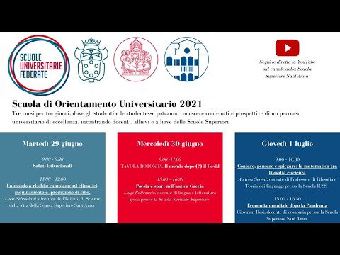 Per il corso della Scuola Superiore Sant’Anna, martedì 29 Giugno, dopo i saluti istituzionali dei tre rettori - Sabina Nuti (Scuola Superiore Sant’Anna), Luigi Ambrosio (Scuola Normale Superiore), Riccardo Pietrabissa (Scuola Universitaria Superiore Iuss Pavia) – è in programma la lezione di Luca Sebastiani, docente di Arboricoltura generale e Coltivazioni arboree della Scuola Superiore Sant'Anna, per affrontare temi come cambiamenti climatici, inquinamento e produzione di cibo. A questa lezione seguono laboratori, incontri con neo laureate e neo laureati, lezioni, confronti con allieve e allievi.