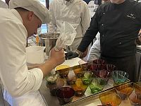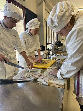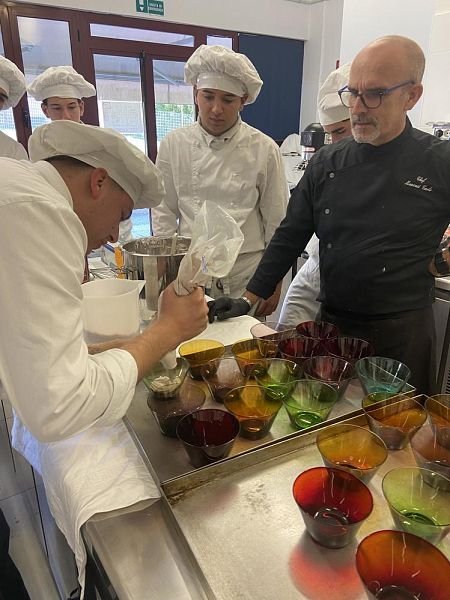 I laboratori di cucina sono stati condotti dallo chef Carlo Mancusi dell’Hotel “La Perla” che è riuscito a creare un entusiasmante spirito di squadra coinvolgendo le classi nella realizzazione di un tipico menu elbano: sburrita di baccalà con crostini di pane, risotto al nero di seppia con julienne di seppioline al rosmarino e gelée di piselli, penne in barca (dall’originale ricetta di Elbano Benassi), polpo all’elbana con patate, calamari spadellati con bietola dolce, crema di mascarpone all’aleatico e schiaccia briaca.