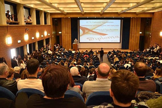 SAN MINIATO — All'istituto tecnico “Carlo Cattaneo” è considerata la cerimonia più sentita di tutto l'anno: stiamo parlando della “Festa dei diplomi” che si è tenuta stamani, sabato 22 febbraio, nell'auditorium del Crèdit Agricole di San Miniato.